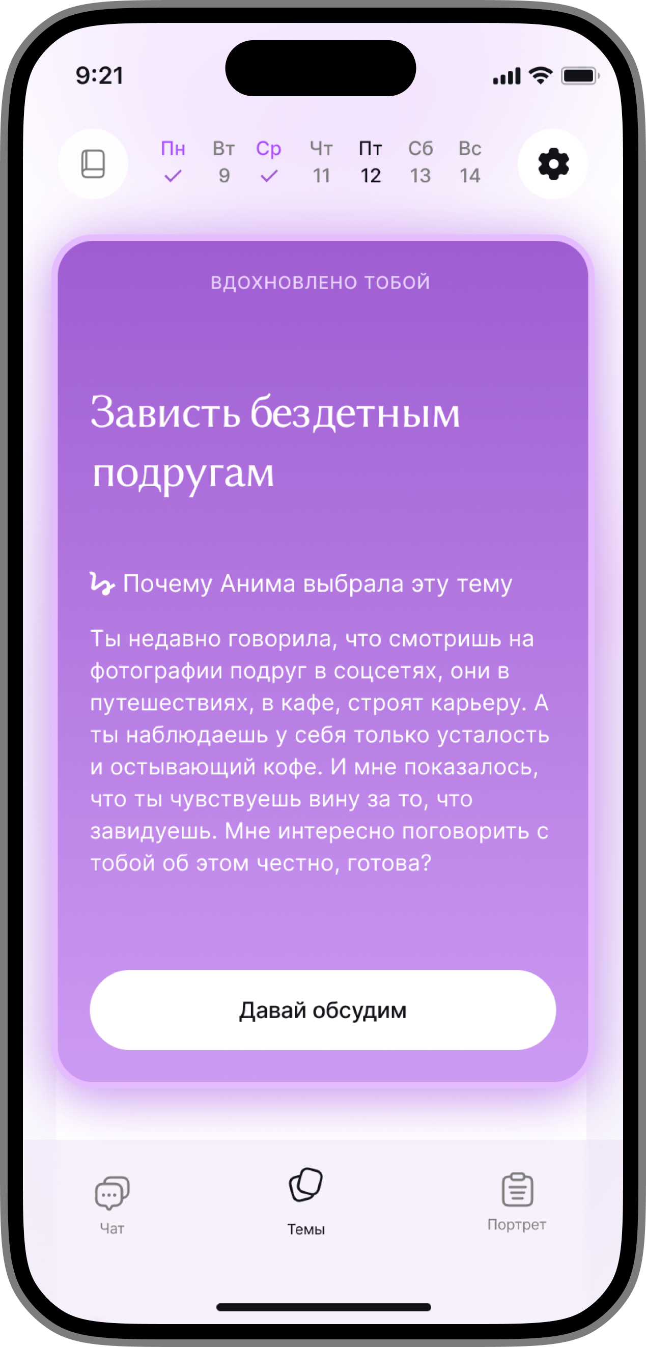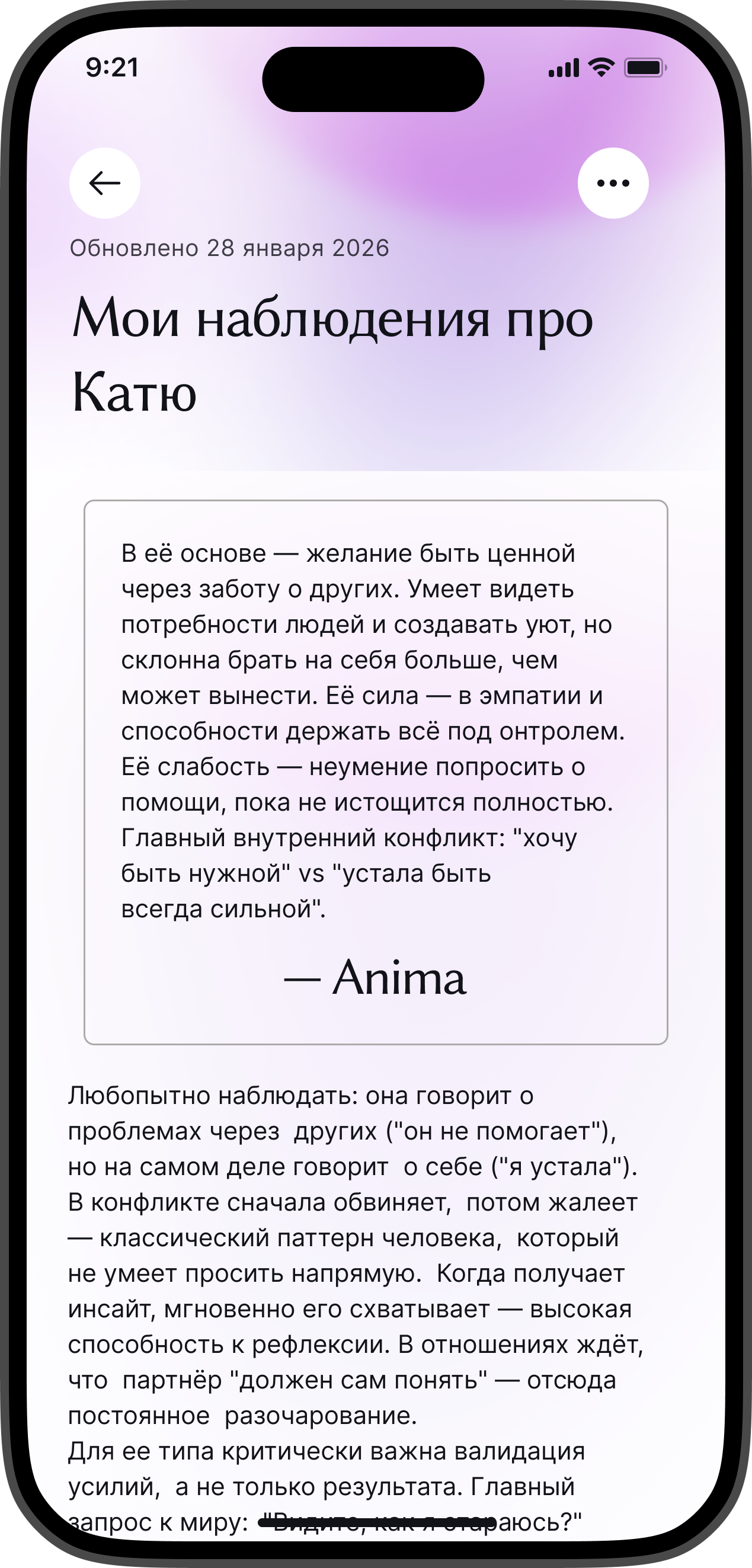 Анима меняет сам подход. Она формирует у мамы новый рефлекс: замечать стрессовую ситуацию сразу, как только она возникает. Проговаривать ее в моменте, продолжая день в стабильном состоянии. Для этого Анима строит глубокий портрет вашей личности, чтобы понять кто вы на самом деле - не функция «мама», а живой человек со своим характером, ценностями и мечтами. И поэтому она говорит с вами на вашем языке.