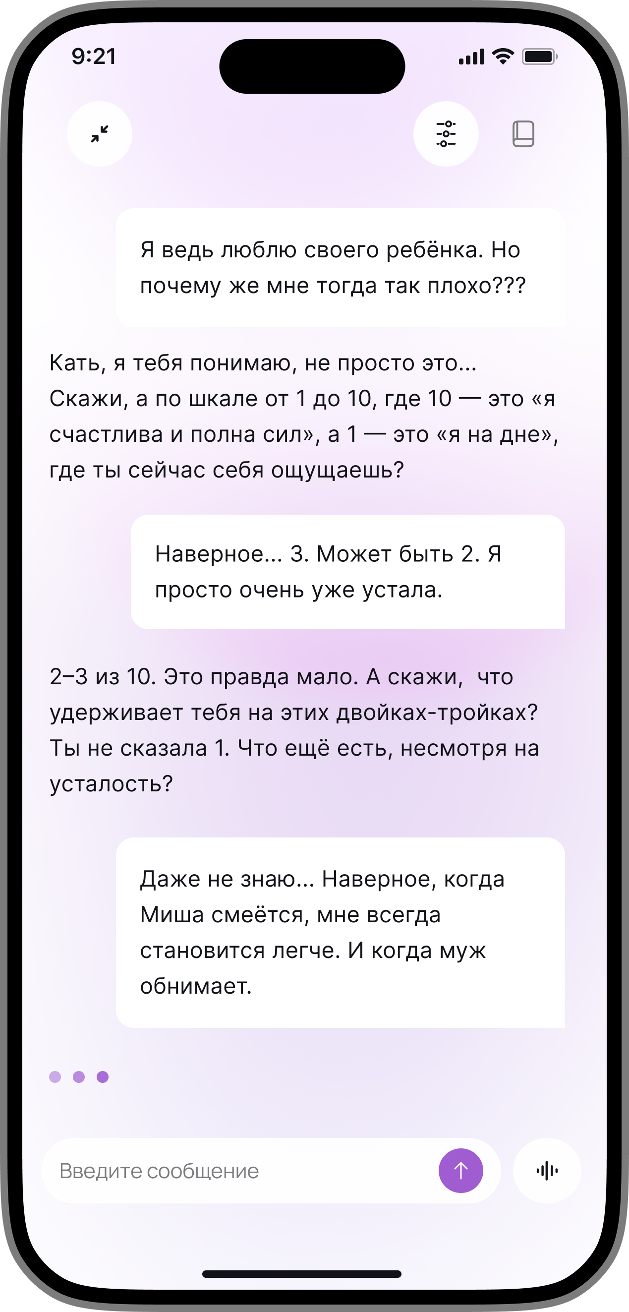 Близкая подруга-психолог, доступная 24/7, когда вам тяжело. Без осуждения. Помнит всю вашу историю.